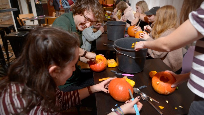 Het was een grote slachtpartij, afgelopen woensdagavond in studentencafé Het Vliegende Paard. Een flink aantal weerloze pompoenen werd met behulp van keukenmesjes en lepels ontdaan van hun ingewanden. Met succes overigens; het resultaat was ...